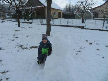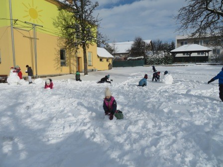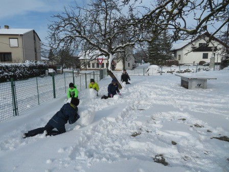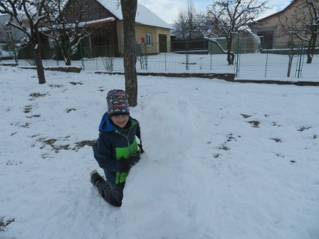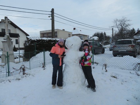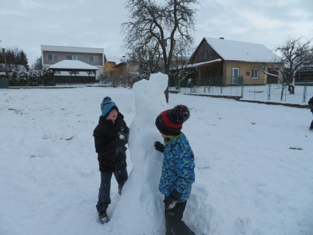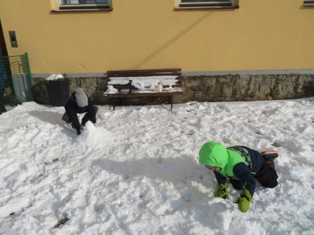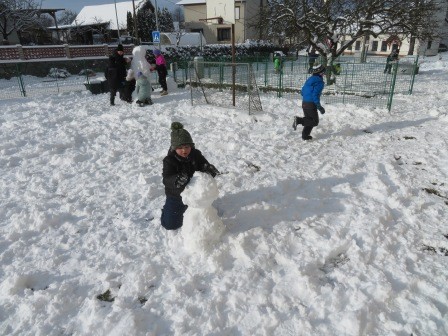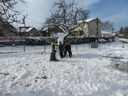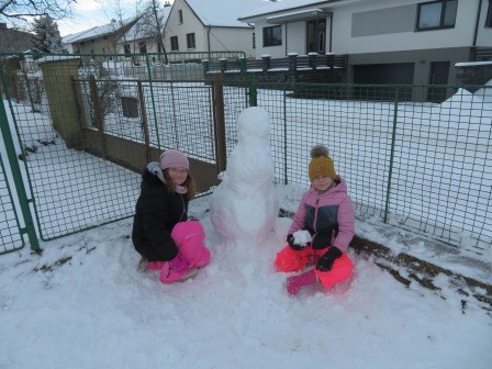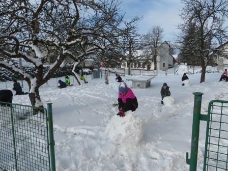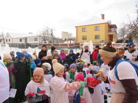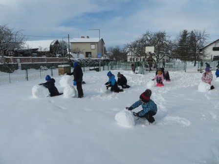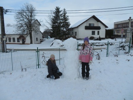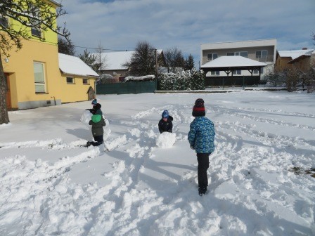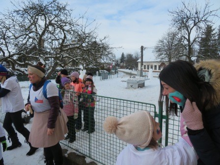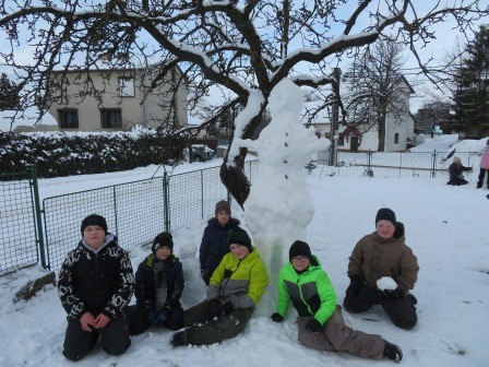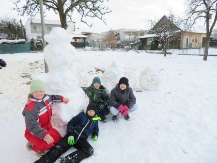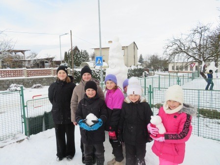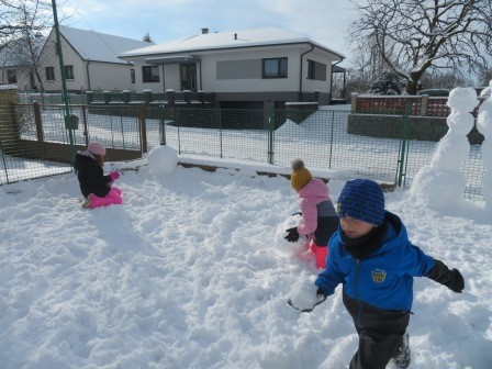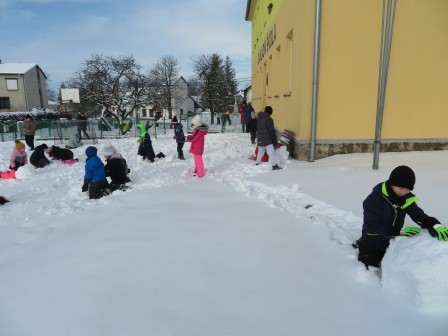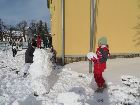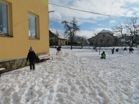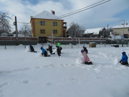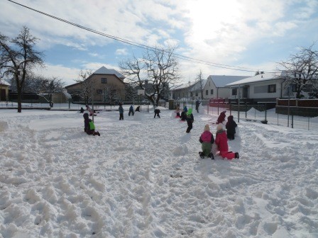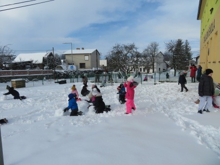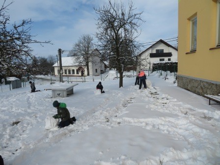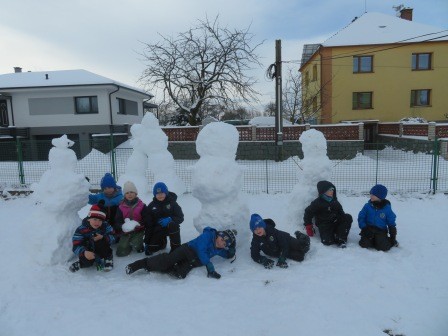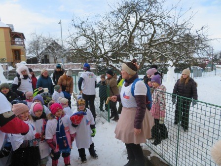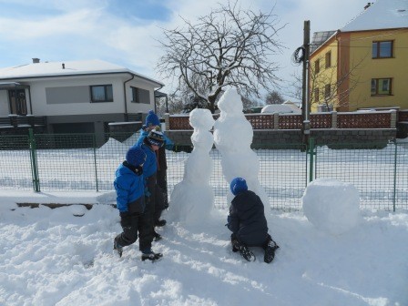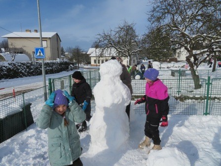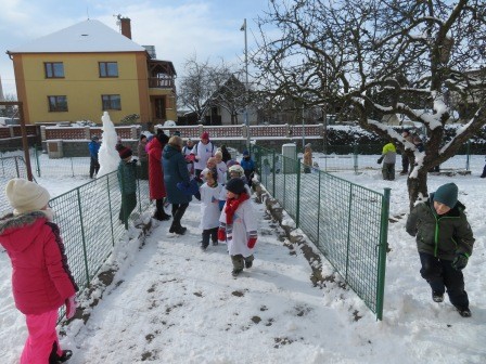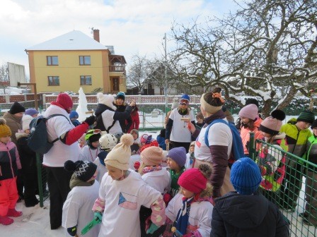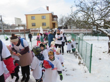 V úterý 17. února jsme jsme se konečně dočkali, přes noc napadl sníh, dopoledne teplota nad nulou, svítilo slunce a my mohli uspořádat na školní zahradě soutěž ve stavění ze sněhu. Navštívili nás také školkáčci, kteří si vypravili na masopustní průvod.